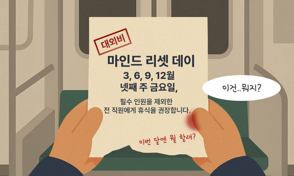 사내 캠페인 홍보지였다. 겉보기에는 전 직원 휴식을 권장하는 ‘마인드 리셋 데이’ 안내였지만, 이미 재작년 날짜와 합병 전 로고가 찍혀 있었다. 이상함을 느끼고 다시 살펴보니, 뒷면에는 ‘대외비’ 표시와 함께 사옥 내 기록 시스템이 일시 정지된다는 공문이 흐릿하게 인쇄돼 있었다. 무엇보다 여백에 빨간 색연필로 휘갈겨 쓴 “이번 달엔 뭘 할래?”라는 문장이 선명했고, 손끝엔 붉은 자국까지 남아 마치 지장을 찍은 듯했다.